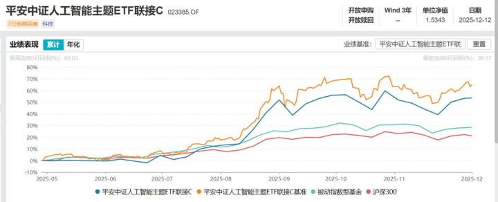 平安中证人工智能主题ETF发起式联接C(023385)成立于2025年4月29日,由刘洁倩管理。wind数据显示,截至2025年12月12日收盘,这只基金成立以来收益率为53.43%。