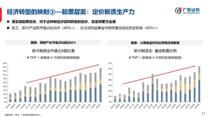对此,广发证券指出,一系列数据显示,“三新产业”占GDP比重提升 → AH新兴产业上市公司收入/利润权重提升(科技+外需)→ AH市值新兴产业权重提升(基准)→ 机构持仓权重突破历史上限。因此,打破传统经验规律,站在新的发展阶段看待AI为主的科技股历史数据,或许能够摒弃噪音、抓住核心矛盾。