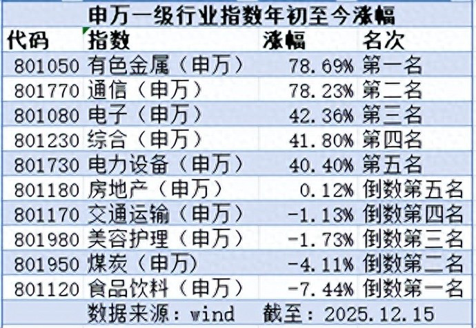 夯爆了:有色和通信。一个是上游矿产,受益于黄金等贵金属价格飙升,年内上涨78.69%;一个是今年行情主线人工智能的最大受益者,年内上涨78.23%。
